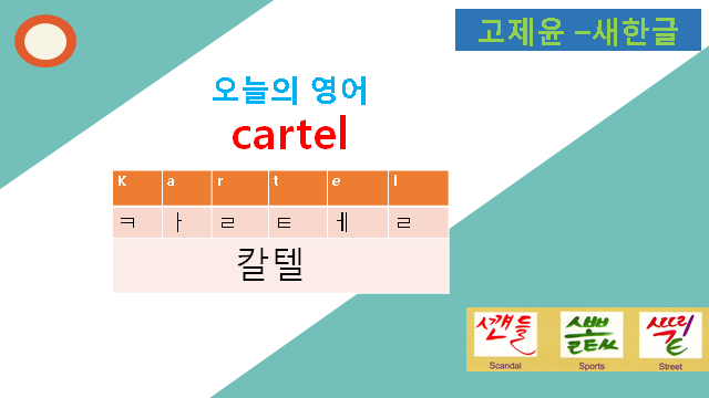 Cartel에 관련하여 현재의 우리말 외래어 표현에서는 주로 '카르텔'로 표기하는 것을 볼 수 있습니다. 이 표현에는 영어에는 없는 '으' 발음이 끼어들어 '르'로 표현되는 것을 볼 수 있습니다. 우리말에서는 중요한 모음 중의 하나인 '으'발음이 알파벳에는 존재하지 않는 소리이지만 영어 발음에서는 자주 '으' 발음을 넣어서 표기하고 소리 내는 것을 볼 수 있습니다.