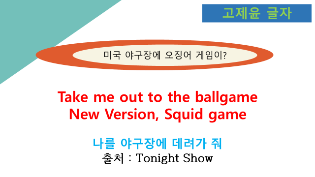 '오징어 게임'이 사랑을 받으면서 야구장에도 오징어 게임이 들어간 단어와 오징어 게임에 빗댄 노래가사가 울려퍼지기도 했습니다. 최근 미국의 대표적인 Talke Show 중의 하나인 Tonight Show에서도 이 노래를 소개하는 영상을 보여주었습니다. 야구장에서 울려퍼지는 노래 가사이며, 대부분의 야구 경기장에서 울려퍼지는 "Take me out to the ballgame"을 개사한 내용입니다.