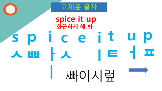Spice it up을 음소로 배열하면 s는 시옷, p는 쌍비읍으로 표현되며, i는 '아이' 그리고 c는 다시 시옷으로 표현됩니다. 위의 파란색 아랫부분이 음소로 나타낸 각각의 소리입니다. 이러한 음소를 모음을 중심으로 배열하면 아래의 제가 개발한 글자 표기로 나타낼 수 있습니다. 음소만을 그대로 결합하여 표기하는 방법입니다. 음소를 하나씩 결합하는 소리 호흡의 배열이 되는 것입니다. 이렇게 글자를 표기하면 훈민정음의 글자처럼 표현되는 것을 볼 수 있습니다. 세종대왕이 훈민정음을 창제하면서 기본으로 삼은 원칙이기 때문입니다.