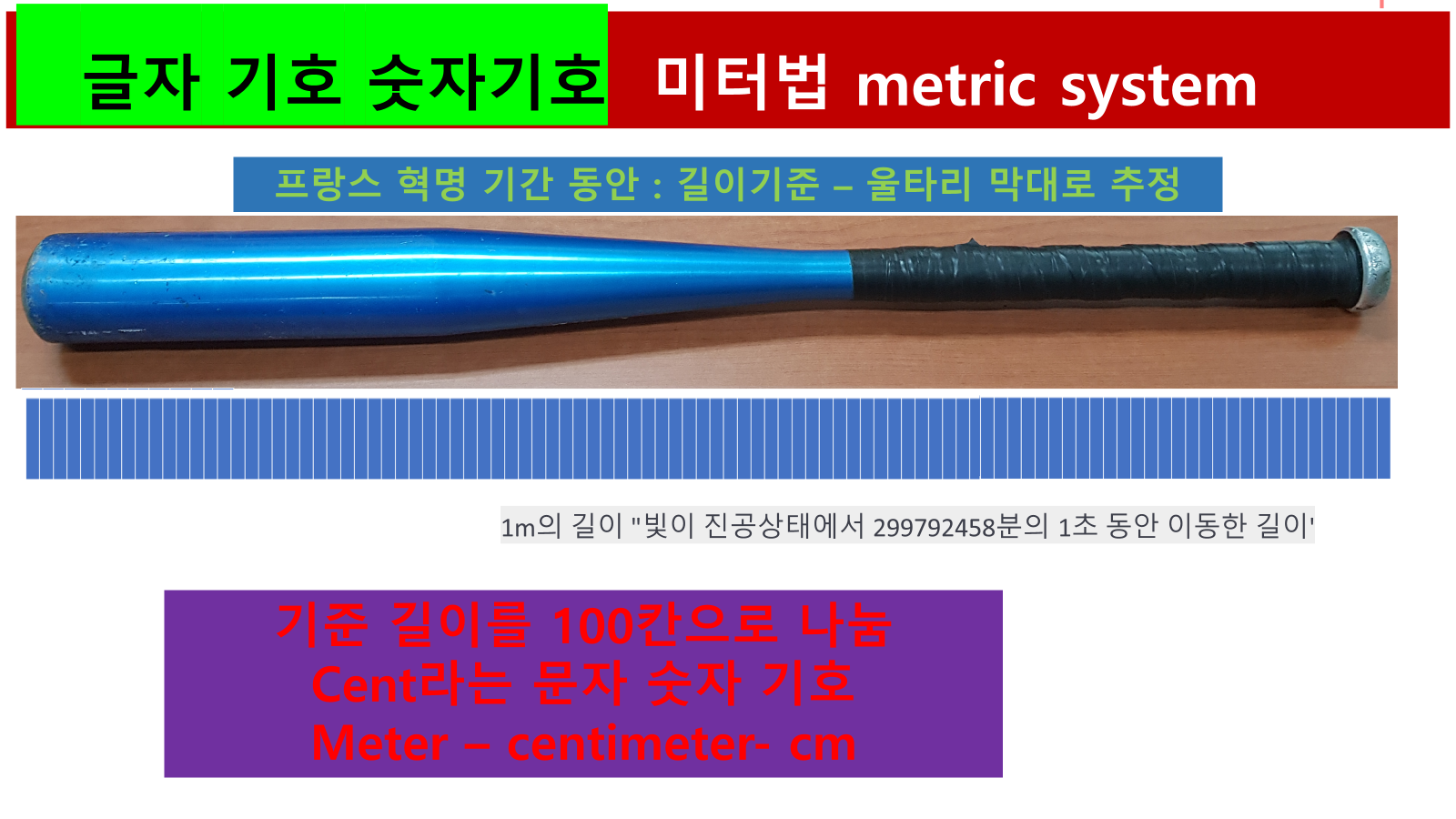 미터법(metric system)이라는 길이 단위는 프랑스 혁명기를 거치면서 등장하였습니다. 길이를 재는 기준 단위로 meter를 표준으로 정하는 방식입니다. 우리가 기준으로 삼는 길이의 기준을 흔히 centimeter에서 확장되어 갔을 것이라는 생각을 하는 경우를 봅니다. 언뜻 길이를 작은 단위에서 큰 단위로 확장으로 이해하는 것이 그럴듯해 보이지만 분명한 기준은 meter가 길이의 표준 단위였고, 이 meter라는 말을 이해할 때 비로소 단위 변환을 이해할 수 있습니다.