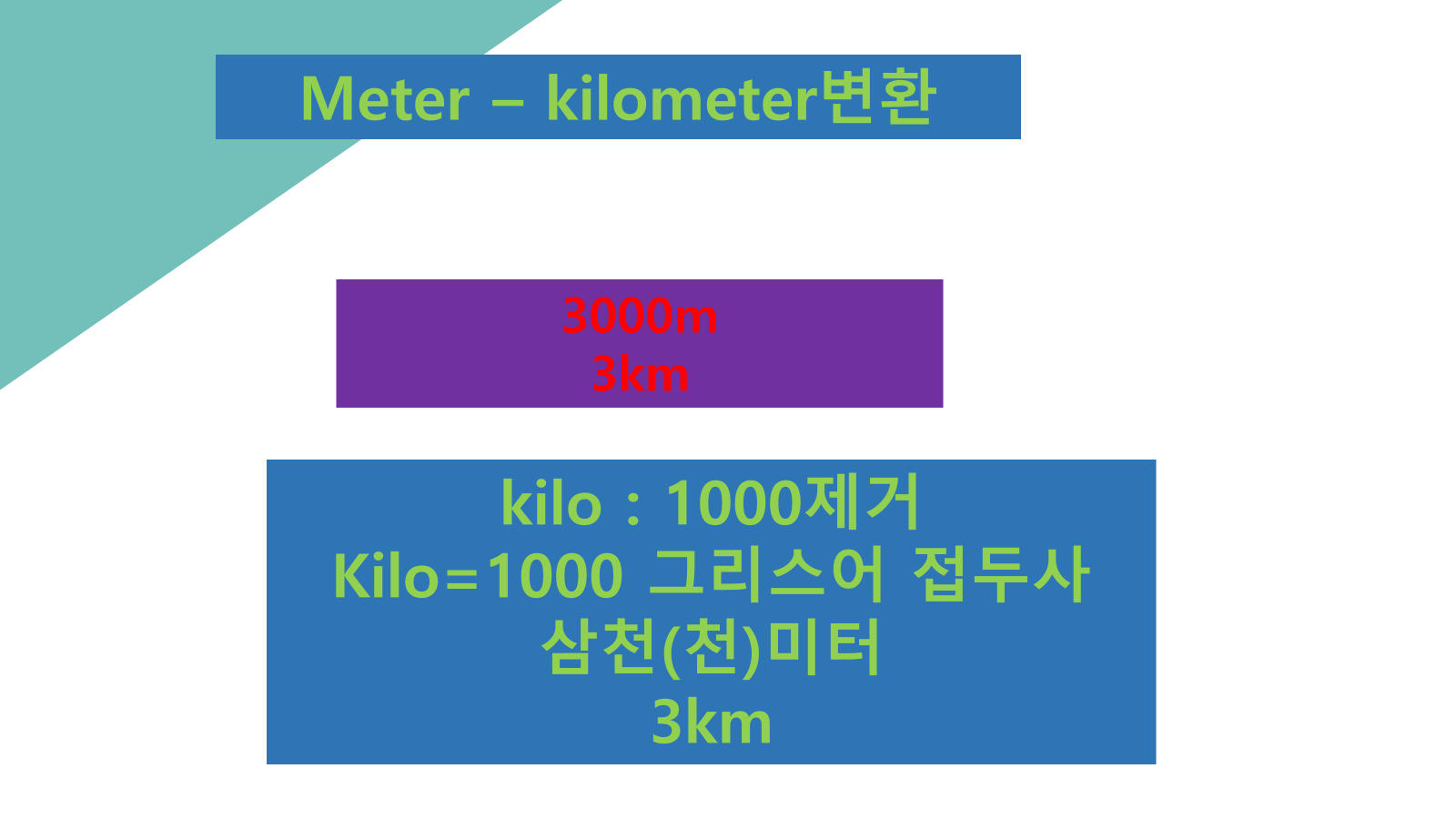 마찬가지로 1meter 단위를 더 큰 길이 단위, 예를 들어 3000m에서 1000에 해당하는 kilo로 변환하면 3kilometer가 되고 다시 이 문자 기호를 k만으로 줄이면 3km와 같은 표현이 됩니다.
