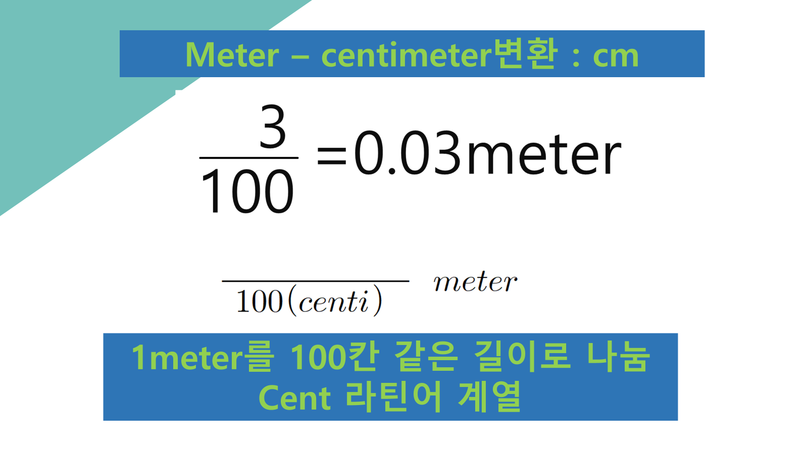 미터 단위를 센티미터로 변환하는 과정은 아라비아 숫자를 문자 기호인 cent로 변환하는 과정으로 이해하는 것이 편리할 수도 있습니다.