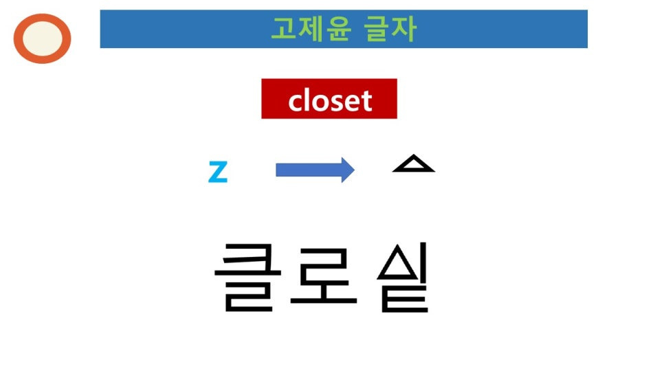 위의 글자에서 볼 수 있듯이 '닫혀있는 공간', '벽장' 등의 의미로 번역되는 closet에서 s는 발음에서는 z발음이 되며, 이 글자를 훈민정음 표기의 원리를 적용하여 나타내면 위의 글자와 같이 표현할 수 있습니다.