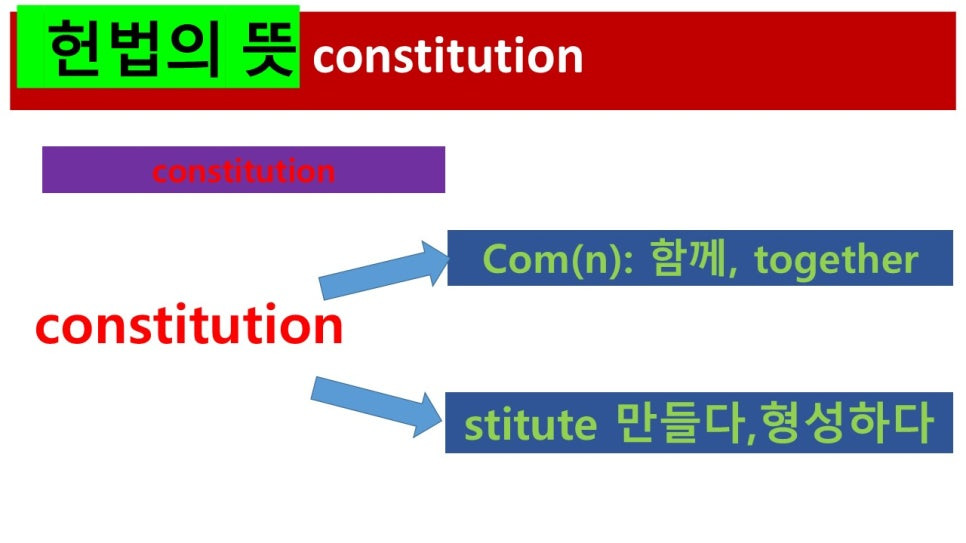 영어단어 "constitution"은 라틴어 'constitus'에서 유래한 단어라고 볼 수 있습니다. 이 단어에서 con(m)은 우리말에서는 함께(together, with)라는 의미에 해당합니다. stitut는 라틴어statuere로 그 의미는 '두다,세우다, 만들다' 등의 의미를 담고 있다고 할 수 있습니다. 거기에 tion이라는 명사로 만드는 접미사가 붙어서 만들어진 단어라고 할 수 있습니다. 즉, "constitution"에는 '서로 힘(뜻)을 합쳐서 만들어낸 것'이라는 의미를 갖는다고 할 수 있을 것입니다.