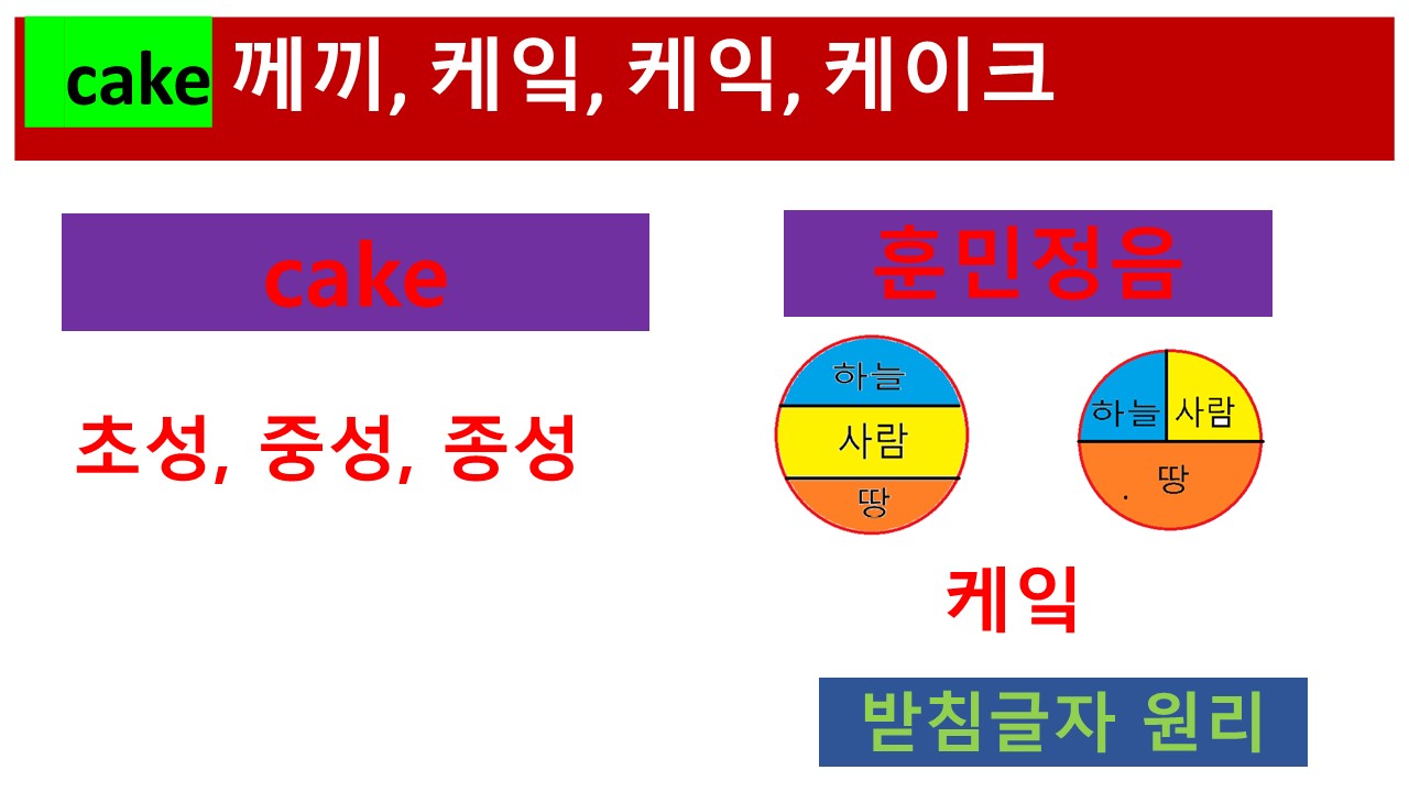 Cake의 [keik]을 일본어 방식의 원리를 적용하면 '께끼'라는 발음이 됩니다. 받침 표기가 없이 단순히 '자음+모음'을 하나의 소리로 이해하는 원리를 적용하여 발음하는 방법입니다. 이 발음 원리는 마치 'back(뒤로)'라는 발음을 '빠꾸, 빠끄'라고 발음하는 원리와 같습니다.