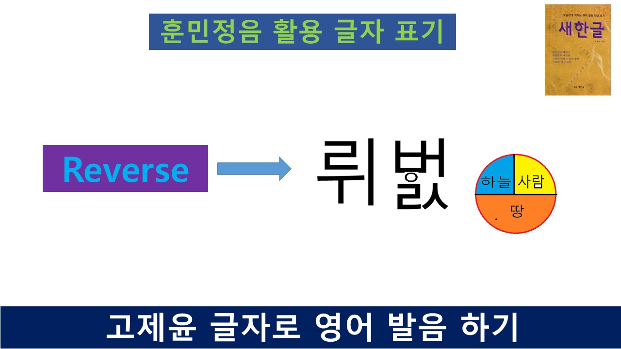 위의 글자 표기는 훈민정음을 활용하여 "고제윤 글자"로 표기한 것입니다. Reverse의 발음은 각각 다음과 같습니다. R은 우리말 '루'나 '로'에 가까운 발음입니다. 여기에서는 '루'로 표기하였습니다. 이어지는 e는 우리말 '이'로 나타나며 이 발음을 '루'와 함께 표현하여 '뤼'로 표현하였습니다. V는 우리말에 없는 소리입니다. 윗니로 아랫입술을 물고 계속해서 마찰을 일으키는 소리이며, 목젖이 울리는 소리입니다. 이 소리의 특성을 영어의 b와 구별하여 비읍 아래에 작은 동그라미를 그려 넣은 표기로 나타냈습니다. r은 리을로 표현했고, s는 시옷으로 표현했습니다. 이렇게 각각의 음소를 바탕으로 훈민정음의 소리 호흡 표기 원리를 적용하여 위의 글자로 표현한 것입니다.
