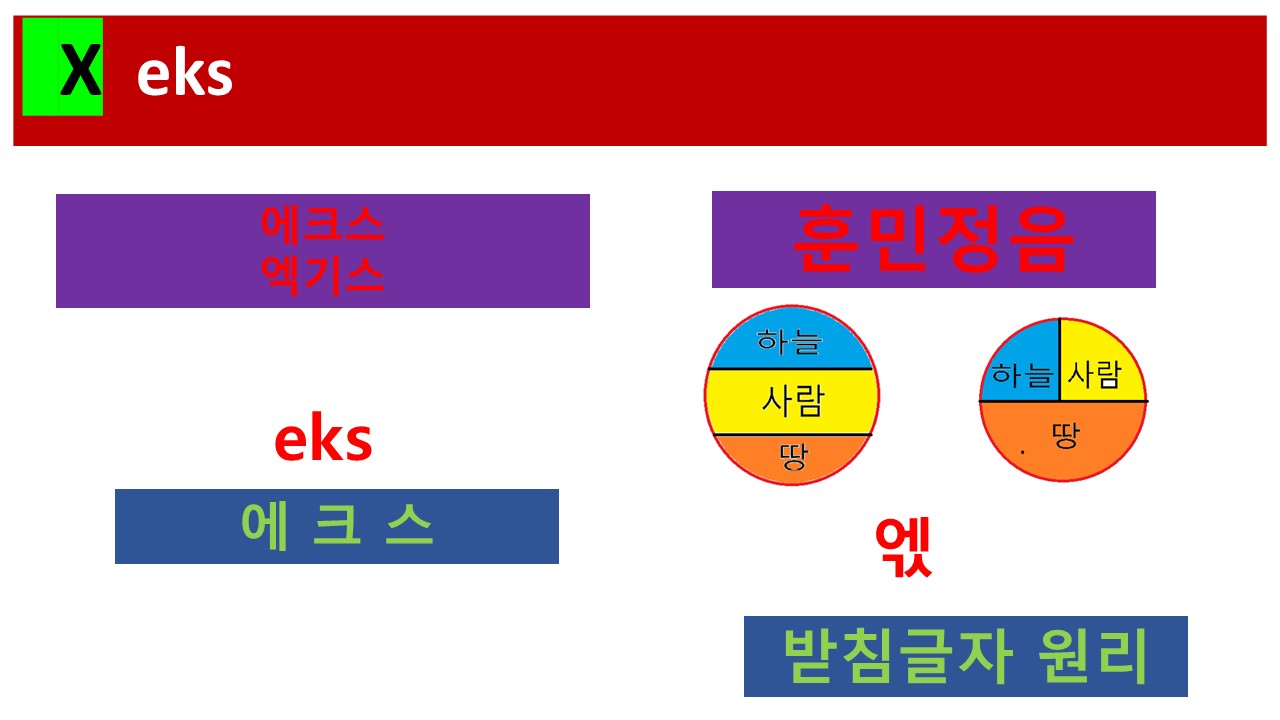 이에 비해서 훈민정음의 소리 표기 원리를 가진 한국인들은 '엑스'로 발음하는 것을 볼 수 있습니다. 받침으로 기역을 선택하여 발음하는 것입니다. 원래의 소리인 [eks]를 [ek]과 [s]로 분리한 것입니다.