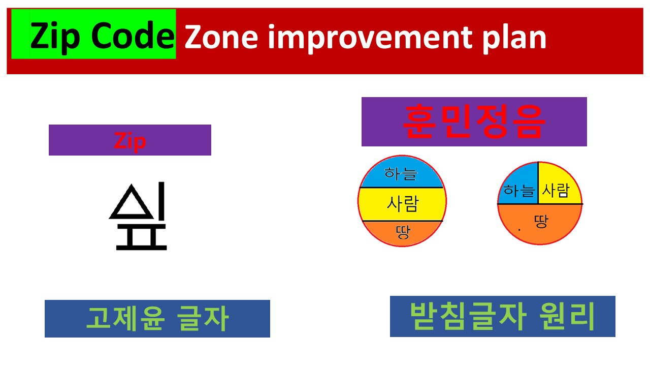 Post Code를 사용하여 지역을 나눈 방식은 행정 구역의 특성상 구불 구불할 수 밖에 없습니다. 바둑판 처럼 가로 세로 반듯하게 좀 더 개선하는 방법이라든가, 아니면, 오늘날 우리나라에서도 '도로명 주소'라고 하여 도로를 중심으로 왼쪽 오른쪽을 나눠서 번호를 부여하는 방법으로 개량을 하게 됩니다. 지역을 개량하여 새로 만든 계획에 따른 숫자 체계라는 의미를 나타내기 위해 'Zone(지역) Imporvement(개량) Plan(계획)'이라는 용어를 만들어 낸 것입니다. 짐작하셨겠지만 이 긴 단어를 줄이기 위해 첫 글자를 따서 'Zip'이라고 하고 여기에 code라는 단어를 붙여서 사용한 것입니다.