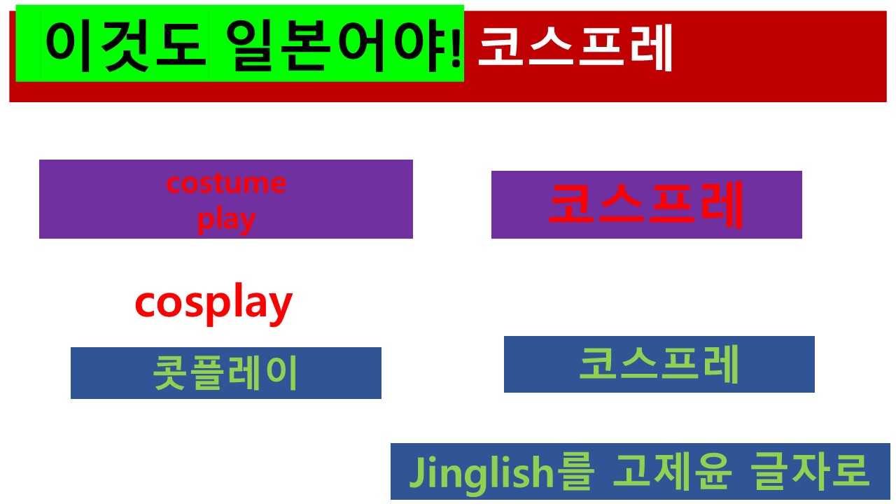 우리말에 한자어 표현이 매우 많은 것을 볼 수 있다면, 일본어는 우리말을 비롯한 외국어나 외래어를 자신들의 방식으로 단어를 조합하여 표현하는 경우가 매우 많이있습니다. 그중에서 일본식 영어 단어 '징글리쉬(Jinglish=Japanese+English)'의 표현도 흔하게 볼 수 있습니다. 오늘은 우리나라에서도 많이 쓰이는 일본인들의 영어 표현 '코스프레'를 살펴보고자 합니다.