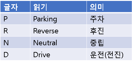 자동차의 방향에서 주로 가장 맨 앞에 있는 기호인 p는 'Parking'을 나타내며, 그 뜻은 '주차'에 해당합니다. 차가 상당한 시간 동안 머물 수 있도록 제어하는 기능을 합니다. '주차된 차'에 해당하는 영어 표현 'a parked car'에서 처럼 한 곳에 오랫동안 머물러 있도록 합니다.