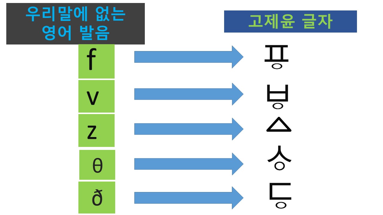 우리말에 없는 영어의 발음은 위의 글자와 같이 표기하여 나타내는 방법입니다. V소리에는 비읍 아래에 작은 동그라미를 그려 넣은 표기를 사용하여, b와 구별하고, f소리는 p와 구별하여 피읖 아래에 작은 동그라미를 그려 넣은 글자를 개발하여 나타내는 방법입니다.