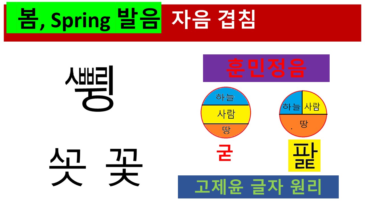 Spring을 분석해 보면 이 글자에는 오직 모음 'i'하나만이 있습니다. 세종대왕이 염원했던 소리 표기의 원리는 모음을 기준으로 하나의 소리 표기를 완성하는 것입니다. 앞의 자음 세 개 spr은 자음의 결합이며, 이 세 개의 자음은 하늘의 소리라고 분류할 수 있습니다. 모음 i는 땅의 소리, 그리고 ng는 다시 사람의 소리, 즉 하늘, 땅, 사람(천지인)이 어울려서 소리로 표현되며, 그 소리는 하늘과 땅 사람의 기운을 담은 자연의 소리라고 본 것입니다. 이 소리글자가 첫소리(초성), 가운뎃소리(중성), 그리고 끝소리(종성)으로 소리를 이룬다고 본 것입니다.