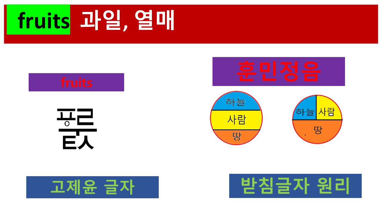 아울러 일본어 방식의 발음 한글 표기를 벗어나 훈민정음 방식의 표기를 적용하여 fruits를 표기하는 원리를 1995년 이래로 고제윤 글자(새한글)로 표기하는 원리를 제시하였습니다,