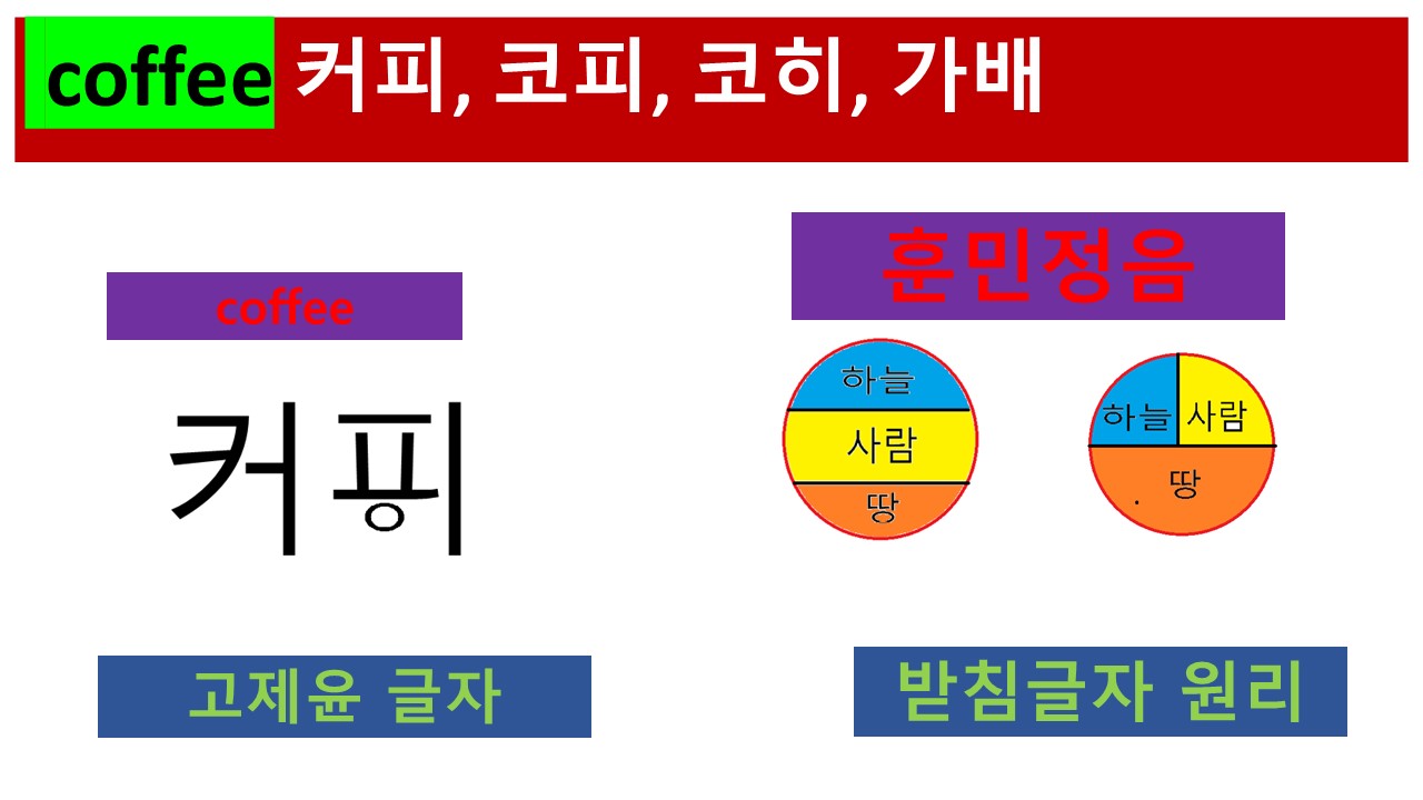 Coffee를 '피읖'으로 발음하는 방식은 현재의 외래어 표기법에 해당합니다. 현재의 외래어 표기법에서는 f를 p와 같이 '피읖'으로 표기하고 있습니다. '커피'라는 발음이 생긴 원리입니다.
