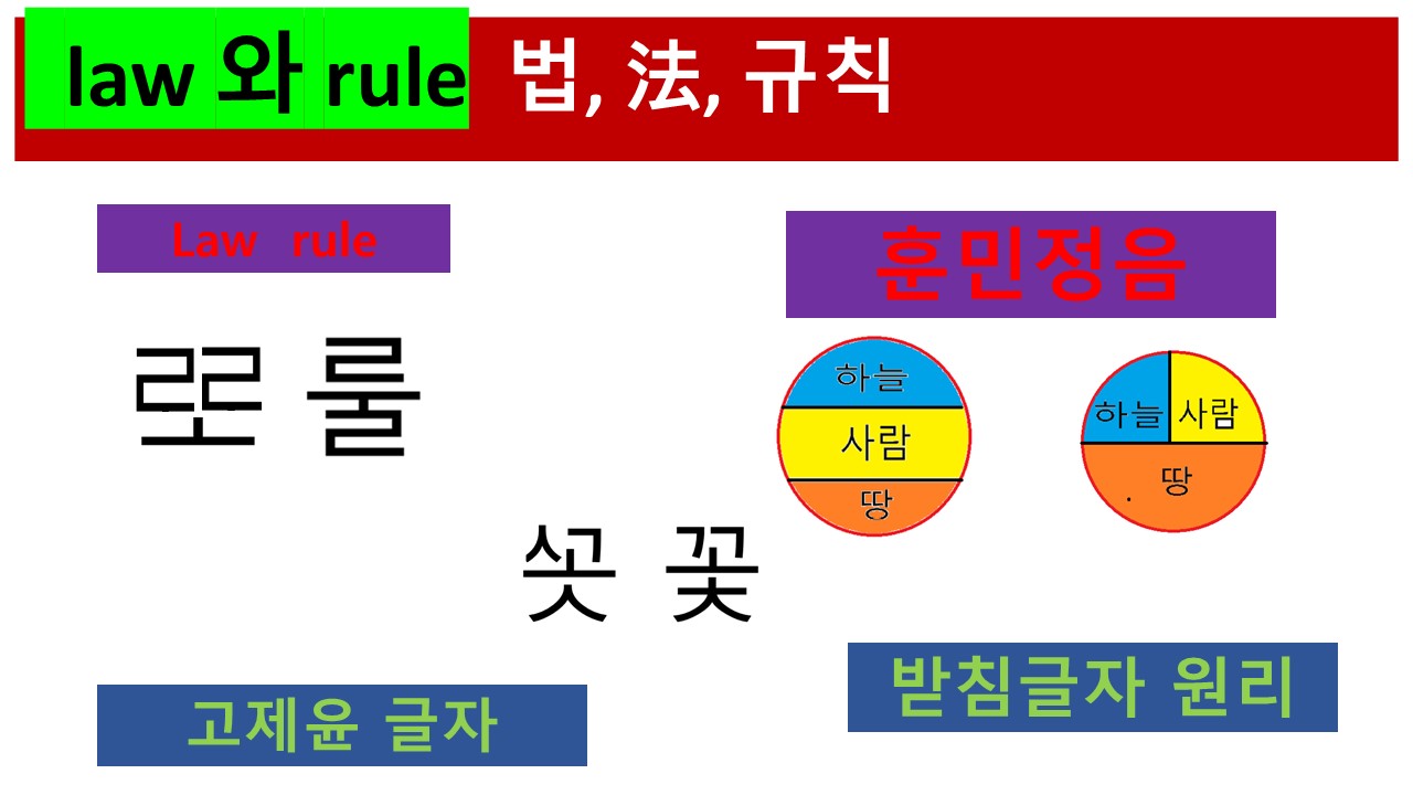 위의 글자는 본 블로그에서 개발한 방식으로 law와 rule을 표기한 것입니다. 위의 글자에서 볼 수 있듯이 영어의 l 발음에 해당하는 위치에 리을을 두 번 사용하여 나타낸 것을 볼 수 있습니다. 영어의 l 발음이 우리말 리을과는 다른 소리 원리를 나타낸 것입니다. 영어의 l 발음은 맨 앞에 나올 때 두 번의 리을을 사용하는 느낌이라고 볼 수 있습니다. 두 번의 리을을 소리 내는 방법은 입모양을 '을'이라고 한 상태에서 다음 리을을 내면 됩니다. 위의 글자를 읽을 때 '을'의 입모양을 하고 '로' 소리를 내면 됩니다.