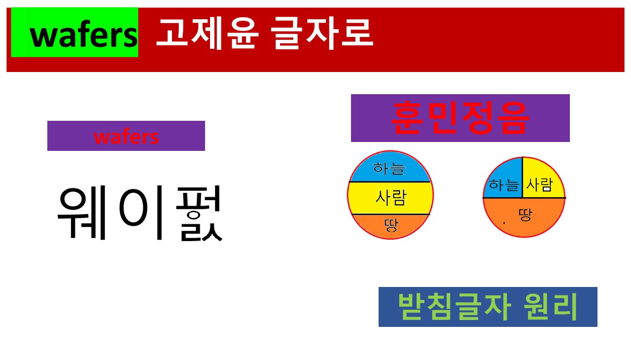 이러한 일본어 발음의 원리를 제거하고 훈민정음 표기 원리에 의해서 오늘의 영어 단어 wafers를 표기하면 다음과 같습니다.