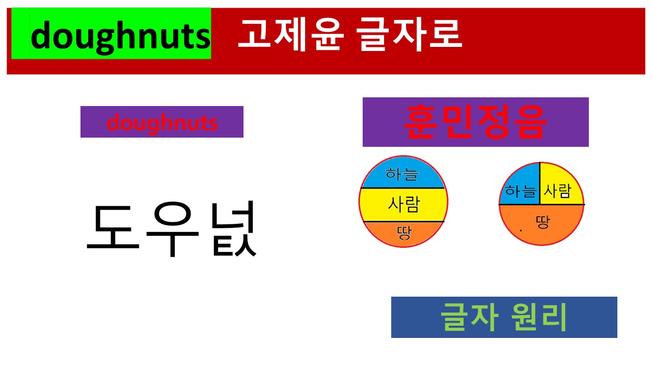 위의 글자는 [ |doʊnʌts]를 각각의 소리 [ㄷ ㅗ ㅜ ㄴ ㅓ ㅌ ㅅ]에 대응시켜 표기한 것입니다. 훈민정음의 표기 원리에서는 받침 표기가 있으며, 받침 글자에 둘 이상을 표기하는 원리도 있습니다. 이 원리를 적용하여 받침에 티읕과 시옷을 표현했습니다. '넡' 발음을 한 상태에서 시옷 소리는 흘리듯이 내면 됩니다.