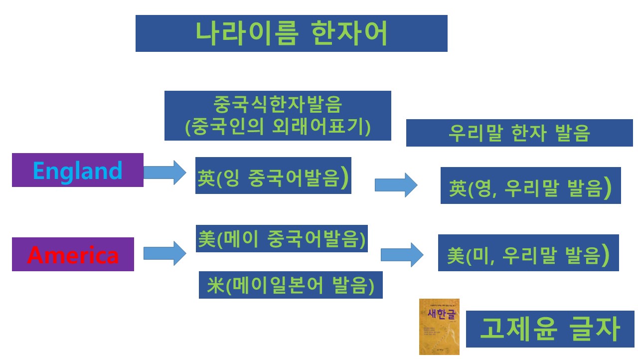 예를 들어 보면 다음과 같이 나라 이름을 부르게 됩니다. 어떤 사람이 자신의 나라 이름을 'England'라고 했다고 하면 이 소리에 가장 가까운 한자어 발음을 가져와서 중국인들이 표기를 했을 것입니다. England에 가장 가까운 중국어 발음(의미도 연관 지어서 표기했을 것임)이 과정이 중국어의 외래어 표기법이며, 한자에서는 '음역표기(가차표기-일종의 외래어 표기)'라고 합니다. Eng에 가장 가까운 소리가 나는 한자어로 英[yīng]이라는 한자어가 선택된 것입니다. 발음으로 보면 중국어의 [잉] 소리와 가장 가깝게 표현한 노력을 볼 수 있습니다. 여기에 앞에서 말한 land를 나라라는 한자어 國을 붙이면 England가 영국이라는 이름으로 불리게 됩니다. 중국인들의 미국과 일본인들의 미국의 '미'자가 각기 다른 이유도 그들의 발음에서 'America'의 '메이'발음에 가장 가까운 한자 표기를 찾은 결과로 볼 수 있습니다.