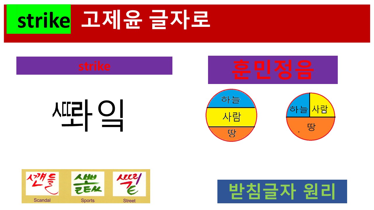 위의 글자는 자음 str이 겹치는 경우에 훈민정음 창제 원리를 적용하여 표기한 것입니다. 영어의 경우 자음 세 개가 겹치는 글자들이 있습니다. str, spr이 대표적인 경우입니다. 위의 단어 Strike처럼 세 개의 자음이 겹치는 경우에 각각의 자음을 한 번에 표기하면 초성(첫 글자)에 세 개의 글자를 표기하는 방식을 적용할 수 있을 것입니다. 이렇게 글자를 각각의 소리에 맞춰 하나의 글자로 표기하면 '스트라이크'와 같은 다섯 개의 글자가 아니라, 두 개의 글자로 표기할 수 있습니다. 또한 r에 해당하는 소리가 우리말 '로'나 '루'가 들어 있는 소리 표현이 가장 비슷한 표기로 볼 수 있으므로 위에서처럼 '롸'로 표기할 수 있을 것입니다.