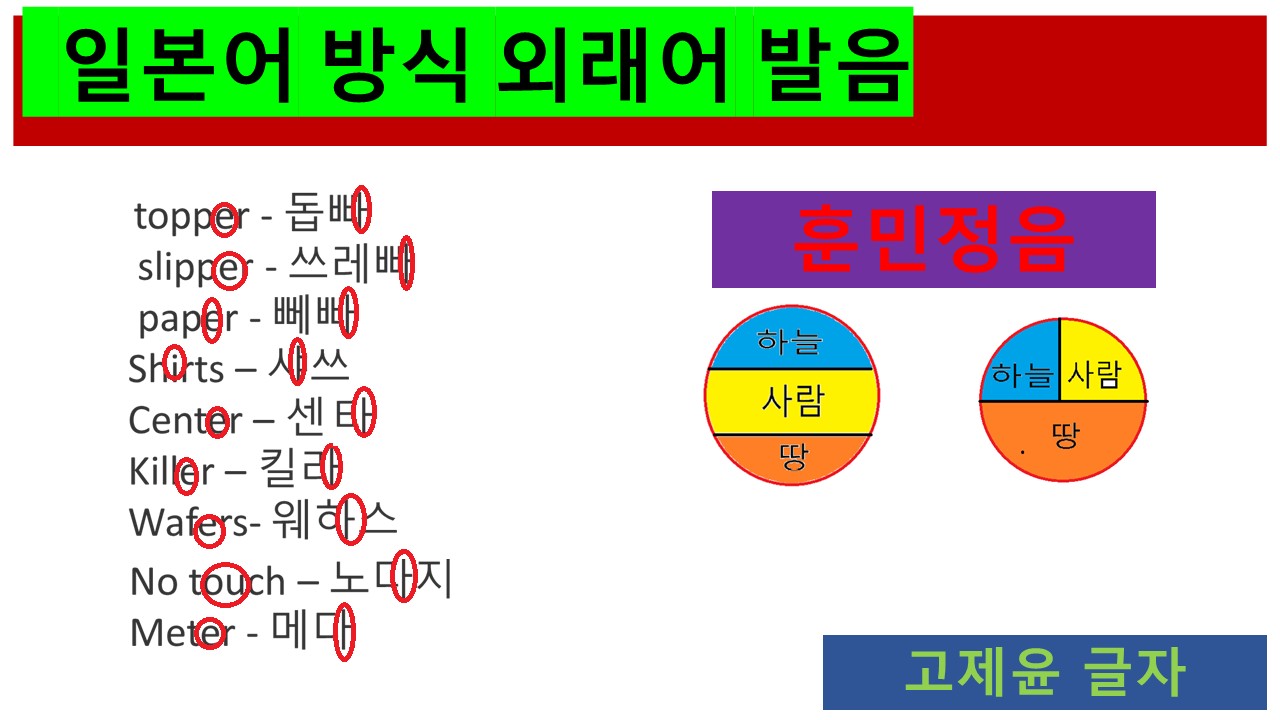 topper - 돕빠 slipper - 쓰레빠 paper - 뻬빠 처럼 위에서 제시한 단어들을 보면 모두 '토퍼, 슬리퍼, 페이퍼' 처럼 한국인들은 충분히 발음할 수 있고, 표기할 수 있음에도 일본인들의 영어 발음을 한글로 표기하도록 했다는 점입니다.