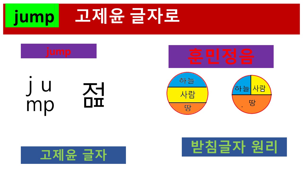위의 글자에서 보듯이 jump는 '점프'가 아니라 '저'에 받침으로 미음과 피읖을 사용하고 있습니다. 우리가 '점프'라고 발음하는 것은 일본어 방식의 영어 한글 표기입니다. 일본인들은 두 개의 글자를 받침으로 사용할 수가 없습니다. 일본어의 특성상, 하나의 받침소리도 버겁습니다. 일제 강점기를 거치면서 받침 소리는 더 이상 확장이 이루어지지 않고 축소되기 시작합니다.