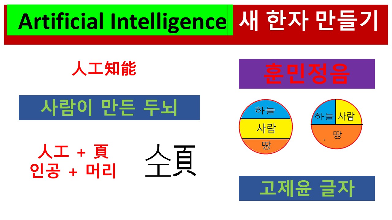 오늘은 Artificial Intelligence를 새로운 한자를 개발하여 표기하는 방식을 통해서 뜻 글자 원리와 소리 글자인 훈민정음의 표기의 차이를 살펴보았습니다.