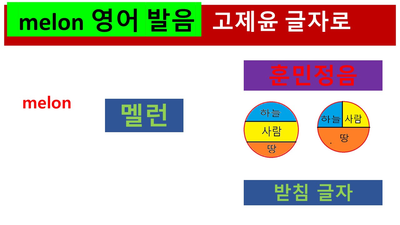 입니다. 각각의 소리에 대응하는 글자를 알파벳처럼 옮겨 보면 [ㅁ ㅔ ㄹ ㄹ ㅓ ㄴ]에 해당합니다. 알파벳 가로쓰기를 훈민정음의 글자 표기 방식으로 초성, 중성, 종성을 결합하여 표기하면 '멜런'이 됩니다.
