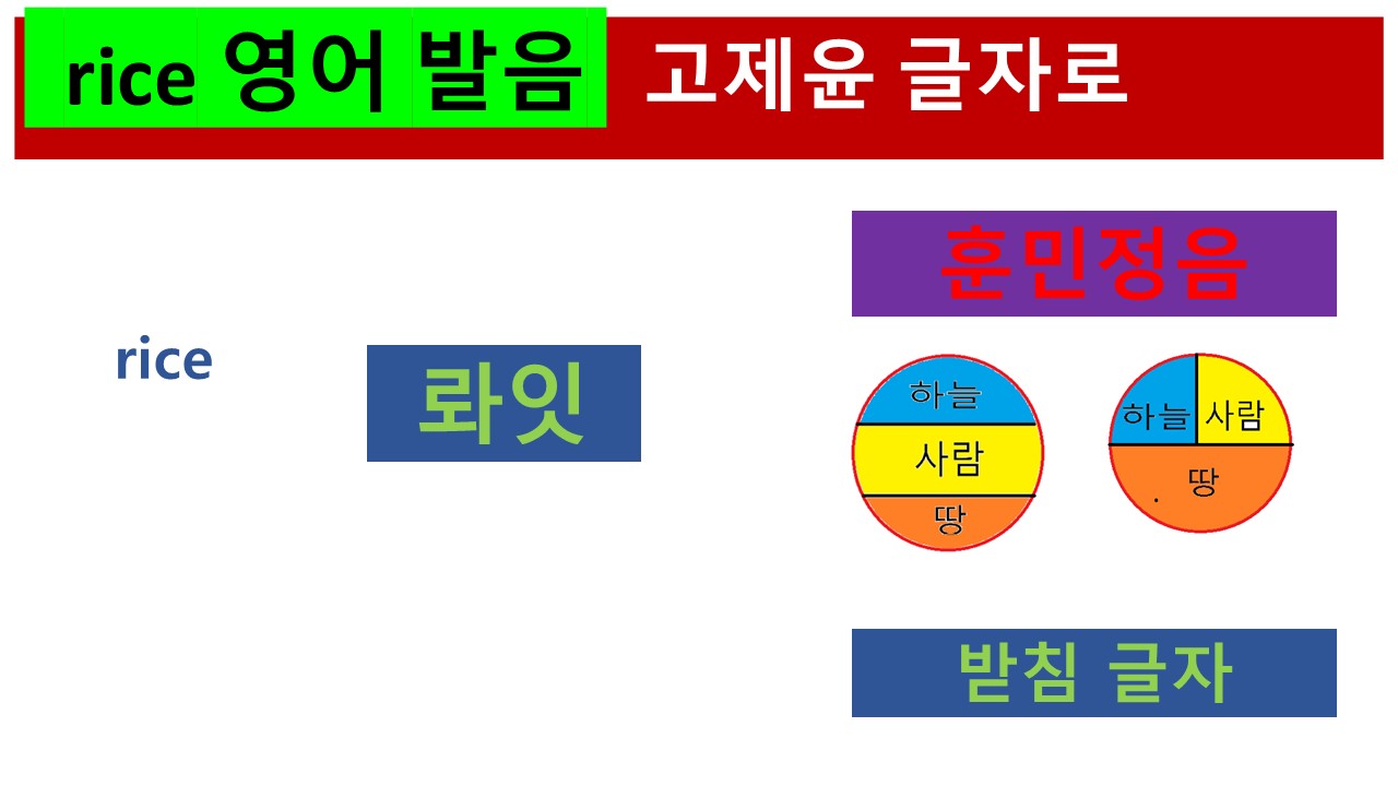 영어의 쌀에 해당하는 단어는 rice입니다. 발음 방법 : '롸잇'는 영어의 발음을 "고제윤 글자"로 표기한 것이므로 우리말 처럼 읽지는 않습니다. '잇'의 발음의 받침에 있는 시옷을 약하게 '스'라고 소리를 내며 읽어야 합니다. 우리말 표기가 아닌 영어발음의 훈민정음 표기이므로 표기된 글자는 모두 읽는 원칙을 가지고 읽으면 됩니다. 영어의 r발음은 우리말의 '루' 혹은 '로'의 상태로 발음을 하면 됩니다. 그래서 위의 표기된 글자처럼 '롸잇'로 읽으면 됩니다.