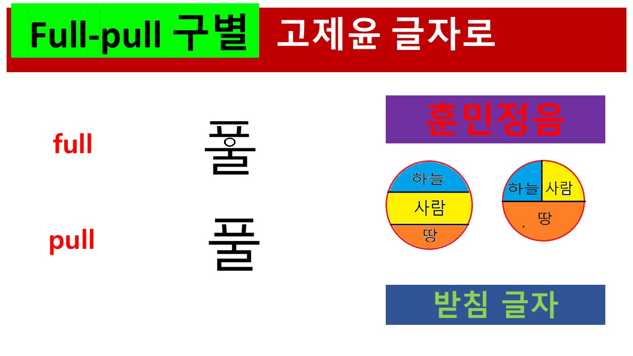 이 둘은 우리말에서는 둘 다 '풀'로 나타냅니다. F와 P만 다르고 나머지 글자와 소리는 똑같습니다. Ull을 공통으로 가지고 있습니다. 따라서 이 둘이 완전히 다른 의미로 사용되는 기준은 f와 p소리에 의해서인 것을 알 수 있습니다. 영어권 사람들에게는 완벽히 다른 이 소리를 훈민정음을 활용한 "고제윤 글자"로 나타내면 다음과 같습니다.