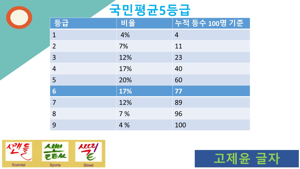 최근 MZ세대를 중심으로 '국평오(5)'라는 말이 유행하고 있습니다. MZ 세대들은 이 말을 듣는 순간 직관적으로 이해할 수 있을 것입니다. '국민평균은5등급'을 줄인말입니다. MZ세대들은 대부분 9등급의 시험 성적을 기준으로 성장해왔습니다. MZ세대들은 쉽게 받아들일 수 있는 말이지만, 그외의 세대들은 쉽게 이해되지 않는 용어일 것입니다. 그런 분들을 위해 잠깐 9등급 성적 체계를 설명하면 다음과 같습니다.