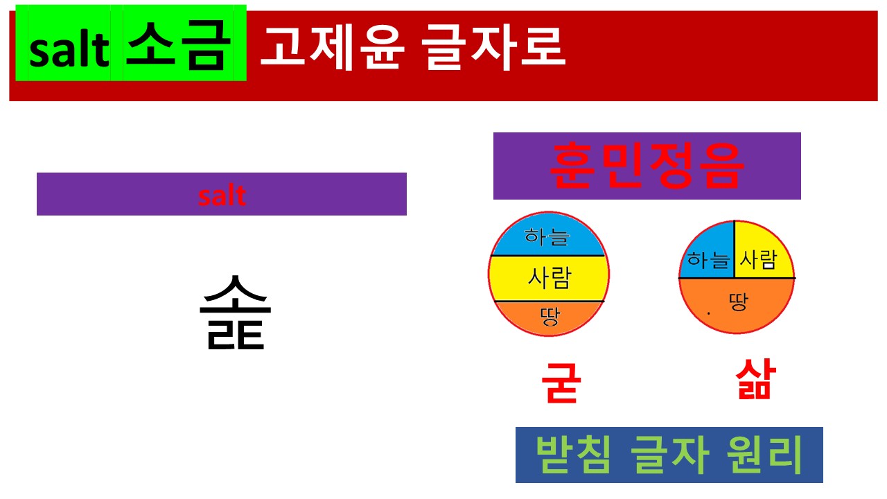 위의 글자는 1995년 이래로 훈민정음을 활용한 "고제윤 글자"에서 제시하는 salt 표기입니다. 위의 글자는 훈민정음 표기 원리를 적용하여 받침으로 영어의 lt에 해당하는 리을과 티읕을 한 번에 표기하였습니다. 흔히 소리글자로 인식되는 알파벳이 각 소리에 해당하는 글자를 가로로 죽 늘어놓는 방식이라면, 훈민정음 방식의 표기는 모음을 중심으로 하나의 글자로 표현하는 방식입니다. 초성, 중성, 종성의 세 가지 소리 요소를 하늘, 땅, 사람과 같이 세 개의 특성을 결합하여 하나의 글자로 표현하는 원리입니다. 이 과정에서 자음이 겹치는 경우의 처리 방법으로 훈민정음 표기는 같은 위치에 함께 표기하는 방법입니다. 현재의 한글 표기에서는 '흙, 삶, 옳, 앉, 낛, 핥,......'등에서 볼 수 있습니다.