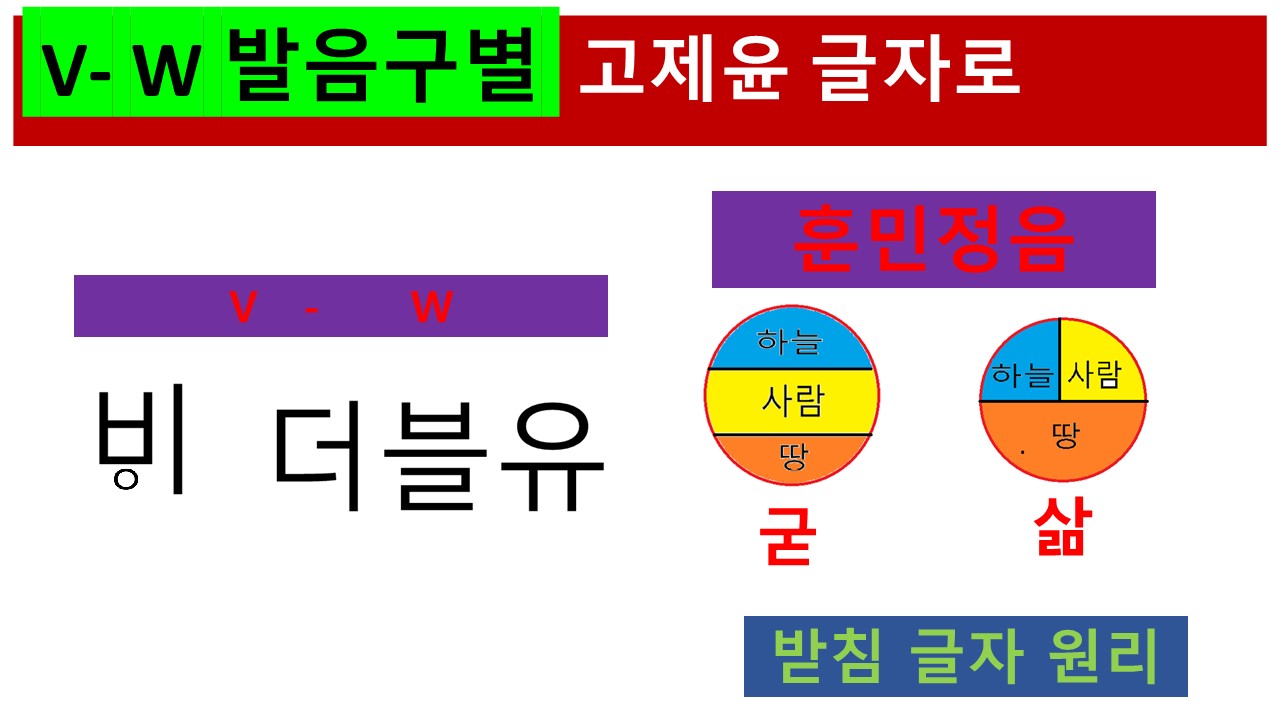 우리말에 없는 'v'소리를 1995년 이래로 훈민정음을 활용한 "고제윤 글자"에서는 비읍 아래에 작은 동그라미를 그려 넣은 표기를 사용하여 나타내고 있습니다. 훈민정음 창제 당시에 존재하던 글자입니다. 한국인들의 언어 구조에서 v를 '비읍'으로 생각하는 것을 고려한 것입니다.