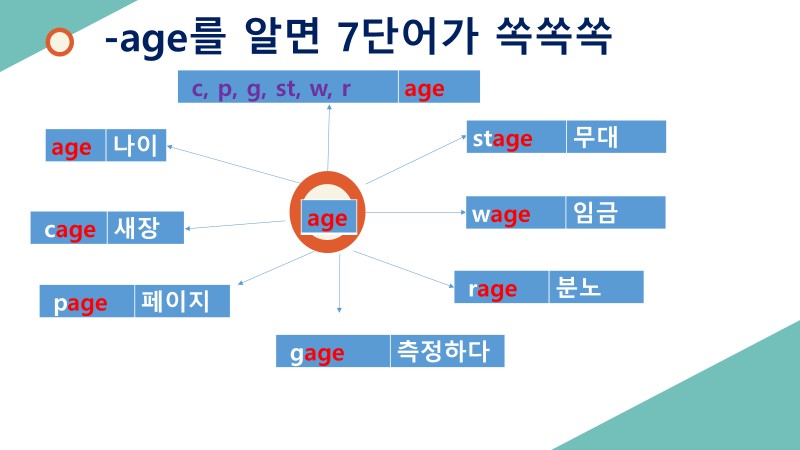 위의 단어들은 공통적으로 'age'(빨간색)를 갖고 있습니다. 여기에 하얀색으로 된 글자는 다른 의미를 갖게 합니다.