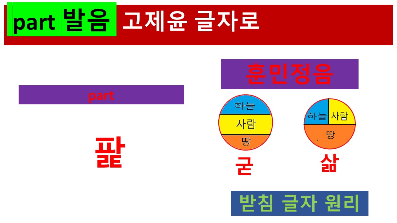 영어 단어 part는 '일부, 부분' 등의 의미를 갖는 단어입니다. 이 단어는 발음을 놓고보면 글자와 일치하는 것을 볼 수 있습니다. Part는 발음 기호로 표시하면 [pa:rt]입니다. 알파벳처럼 각각의 음소를 가로 쓰기로 하면 [ㅍ ㅏ ㄹ ㅌ]가 됩니다. 가로 쓰기로 되어있는 각각의 소리를 훈민정음의 글자 표기 원리를 사용하면 '팙'로 표기할 수 있습니다. 모음이 'a'하나이므로 하나의 글자로 표기할 수 있습니다.