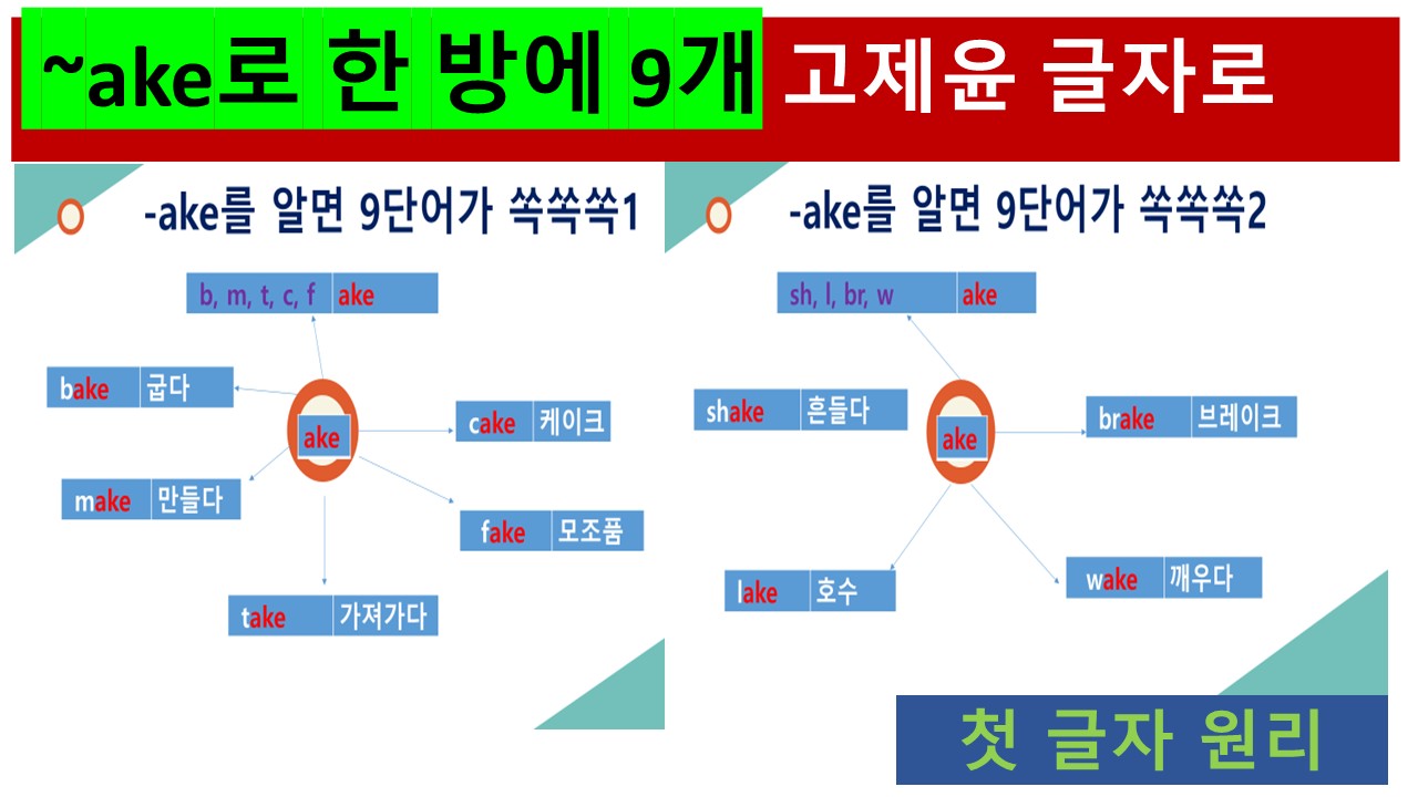 이제 make에서 'm'을 뺀 'ake'의 발음 'ㅔ잌'을 가지고 다른 단어들로 확장시켜 보겠습니다. Cake는 c가 k발음이 됩니다. 우리말 '키읔'에 해당합니다. Cake발음으로 연결하면 '케잌'이 됩니다. Cake은 '케잌' 대신에 케이크'처럼 모음 'ㅡ'를 넣어서 발음하거나 글자로 나타내는 경우도 있지만 '께끼(아이스께끼)'에서와 같은 일본어 방식의 발음을 그대로 사용하는 경우도 있었습니다.
