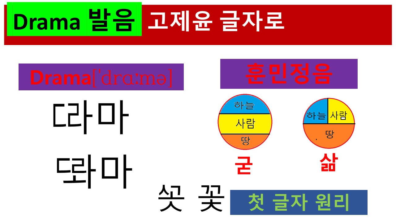 아래의 글자는 drama의 영어 발음을 표기한 것입니다. R소리가 영어에서는 첫 소리에서 '로, 루'와 비슷한 소리라는 점을 고려하여 나타낸 표기입니다.
