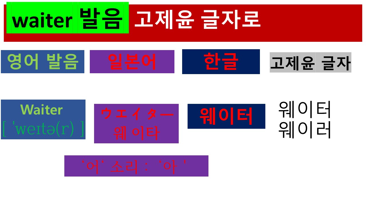 일본어의 경우 가타카나에서는 '어' 발음이 없습니다. 일본어의 발음 특성입니다. 이와 관련된 내용은 거의 매번 본 블로그나 네이버, 유튜브의 "글퍼블릭"에서 설명하는 내용입니다. 중요한 모음 중의 하나인 '어' 발음이 없는 가타카나의 치명적 약점이기도 합니다. 일본인들이 영어를 비롯한 외국어 학습에 어려움을 겪는 이유 중의 하나이기도 합니다. 또한 본 블로그나 유튜브를 통해서 일본인들의 영어 학습법으로 훈민정음을 활용한 "고제윤 글자"를 제시하는 근거이기도 합니다. Waiter의 일본어 발음이 '웨이타'인 이유인 이유도 '어'를 표기하거나 발음하지 못하기 때문입니다.