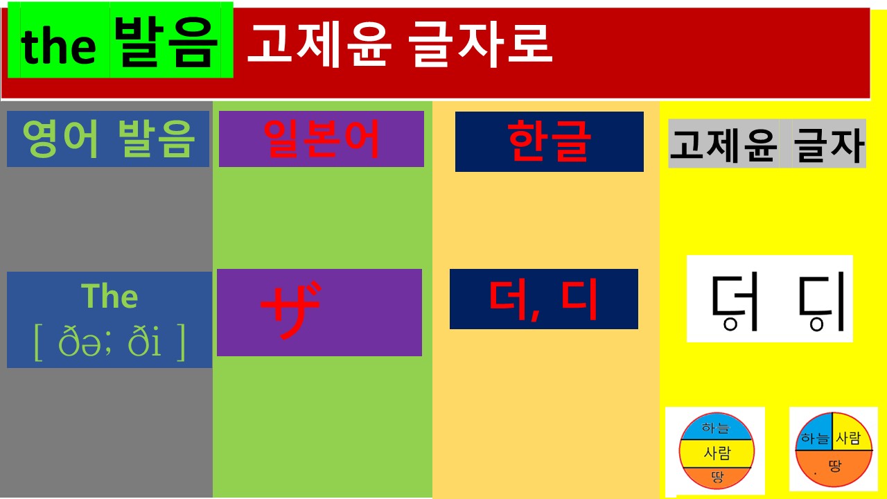 위의 글자는 the발음을 영어 발음 기호, 일본어 발음, 그리고 한국어 발음 표기를 표현하였습니다. Th발음은 한국인이건 일본인이건 상당히 어려운 발음입니다. 명백히 이 두 나라의 언어에는 없는 소리입니다. 이 소리를 훈민정음을 활용한 "고제윤 글자"에서는 디귿 아래에 작은 동그라미를 그려 넣은 표기를 사용하여 '더'나 '자' 발음과 구별되는 발음을 제시합니다. 소리를 내는 방법은 "양 니로 혀를 물고 '더'에 가까운 소리를 내는 것"입니다. 위의 사례에서 보듯이 다른 글자로 표기하는 것은 다른 소리를 이해하는 중요한 수단입니다. 다른 글자 기호로 표현하고 이해한다면 그 소리를 이해하는 중요한 방법이 될 수 있을 것입니다.