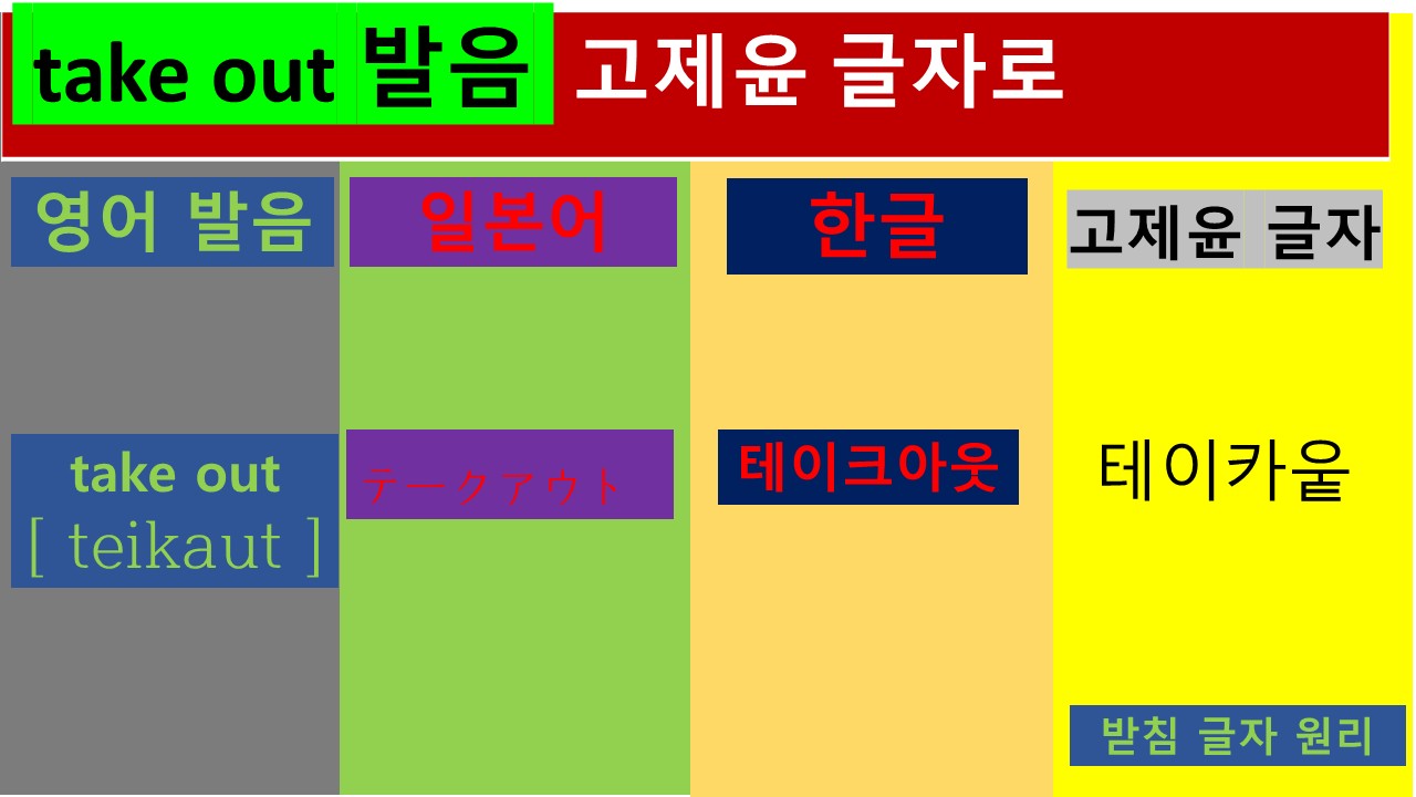 * 오늘은 take out의 발음을 영어, 한국어, 일본어의 발음과 표기 원리를 살펴보았습니다.