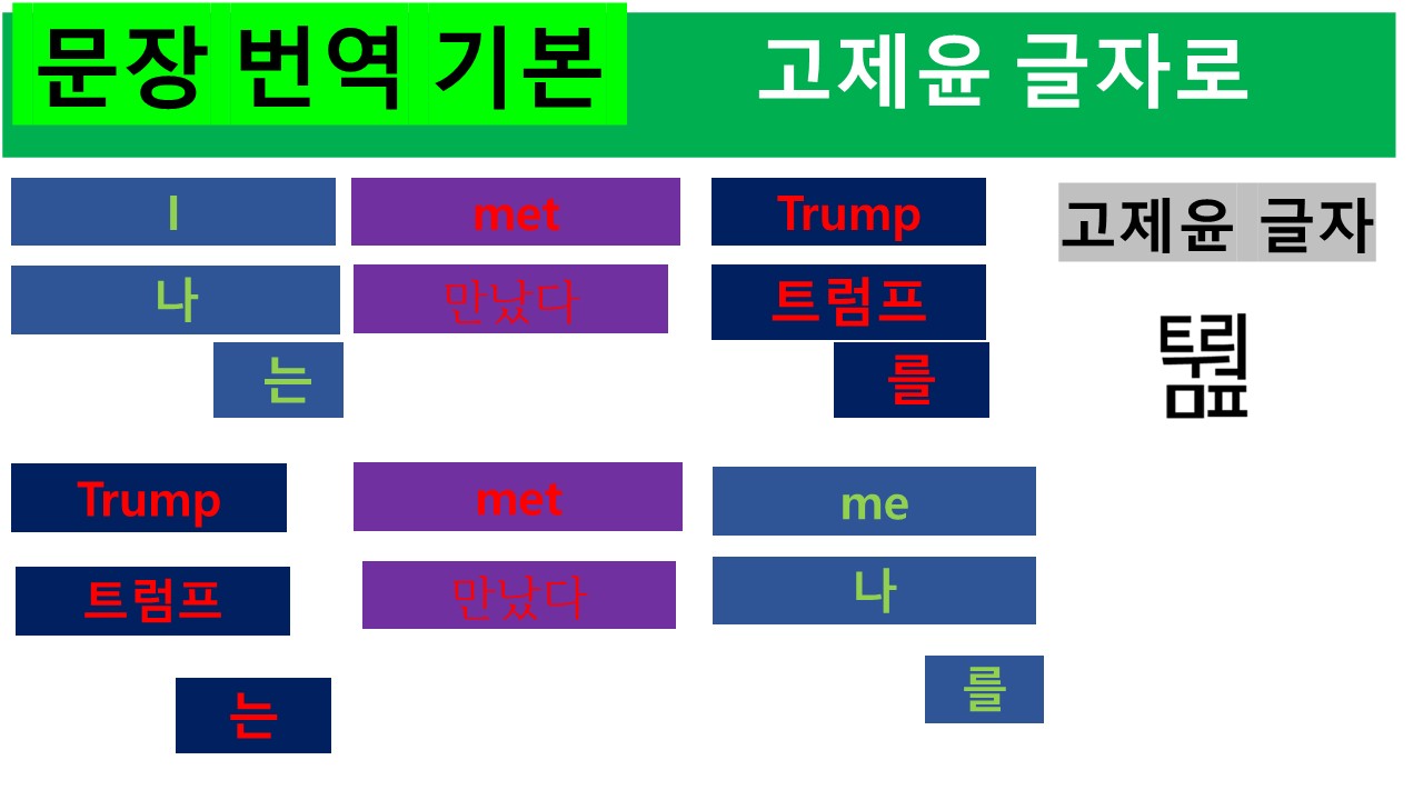 I라는 단어는 '나'를 의미하고 이 단어를 우리말로 옮기는 과정에서 '는'이라는 조사를 붙였습니다. 이렇게 '은, 는, 이, 가'를 붙여야 의미가 통합니다. Trump에는 위치에 따라 첫 번째 문장에서는 '를'을 붙였고, 두 번째 문장에서는 '는'을 붙였습니다. 영어는 문장에서의 단어의 위치가 바뀌었지만, 우리말로 이해하기 위해서는 '조사'를 붙여야 합니다. 역으로 말하면 우리가 영어로 문장을 표현하기 위해서는 우리말의 조사를 제거한 상태로 사용해야한다는 의미이기도 합니다.