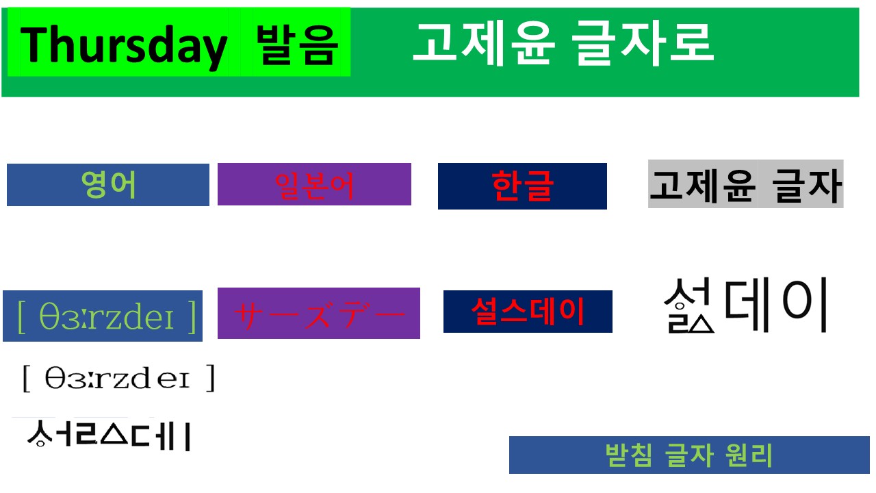 Thursday를 소리의 호흡 단위로 나눠보면 thurs는 하나의 호흡입니다. 모음 하나가 중심을 차지하여 자음을 첫소리와 받침으로 표기하는 방법으로 훈민정음 방식의 소리 표기를 적용할 수 있습니다. 위의 표에서 보는 오른쪽 맨 끝의 글자 표기입니다. 받침에 두 개의 자음을 표기하였습니다. 현재의 한글에서도 '삶, 옳, 앉, 닭,....'등에 남아있는 원리입니다. Thursday의 'day'발음은 [dei]를 현재의 한글을 그대로 적용하여 '데이'로 표현했습니다.