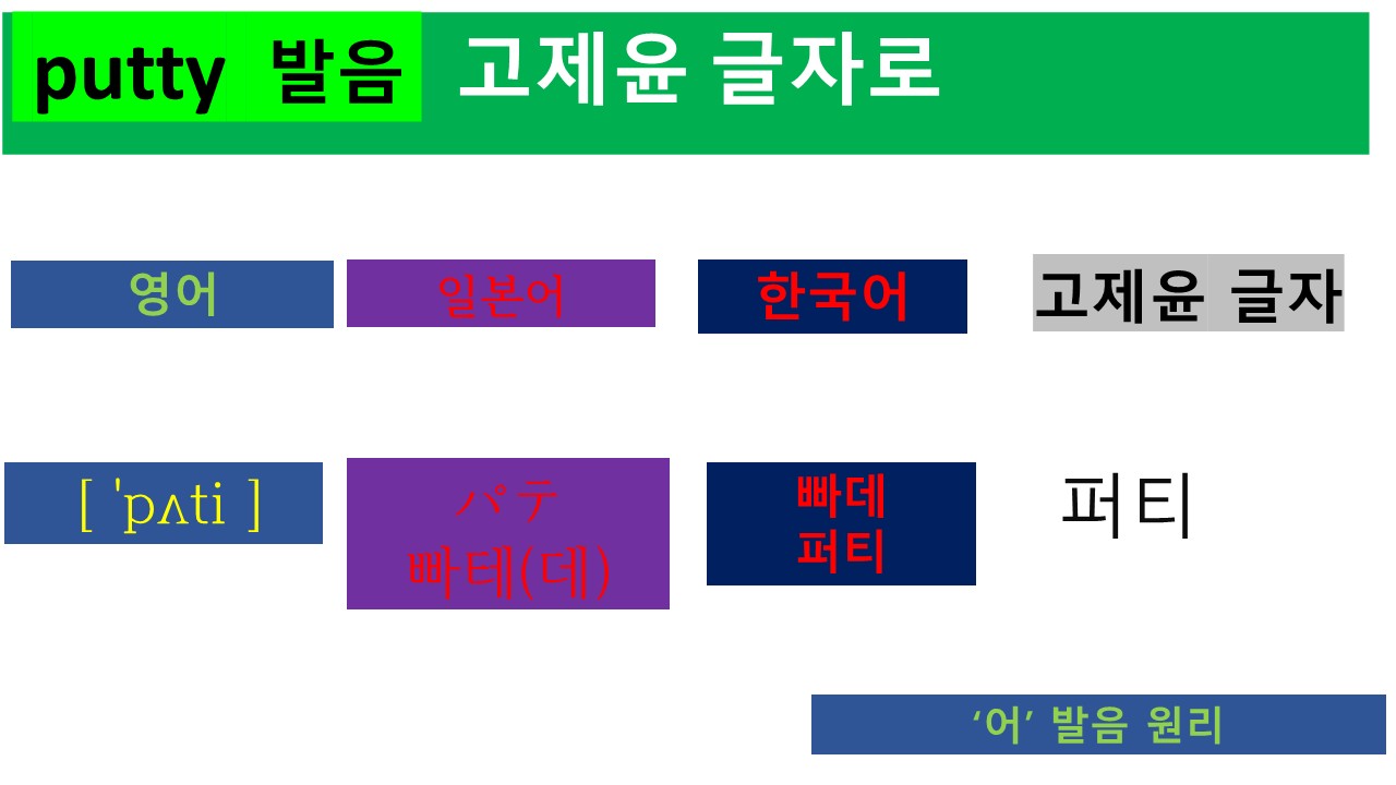 영어 단어 putty를 발음 기호로 나타내면 [ ˈpʌti ]입니다. 알파벳이나 발음 기호 모두 가로로 글자를 배열하는 방법입니다. 한글을 사용하여 표현하면 [ㅍ ㅓ ㅌ ㅣ]입니다. 자음과 모음을 합하여 표기하면 '퍼티'입니다. 실제 현재의 한글로도 비슷한 발음으로 표현할 수 있습니다. 훈민정음을 활용한 "고제윤 글자"에서도 현재의 한글을 그대로 사용하여 표현하고 있습니다.