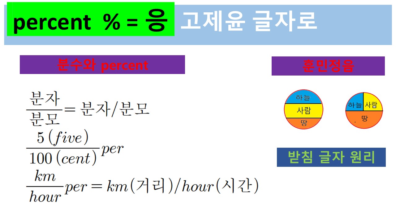 영어 단어 'per'는 분자와 분모를 구분하는 경계를 의미합니다. 'per'의 의미는 '~마다' 혹은 '나누기'의 의미를 갖습니다. 위에서 읽는 30percent는 "30 나누기 100"의 의미입니다. 만약 '5%'라고 하였다면 이 말에는 "5 나누기(per) 100(cent)"입니다. 한글 '응'의 글자를 활용하여 생각해 보면 위에는 분자, 아래에는 분모를 표현하는 방법입니다.