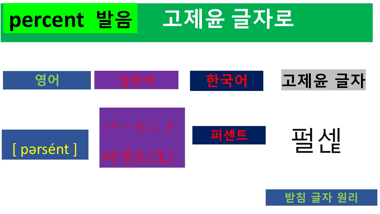 영어 발음 percent는 한국인들은 대부분 '퍼센트' 발음을 합니다. 한국어에는 '어' 발음이 있는 덕분에 '퍼' 발음을 합니다. Cent발음은 일본인들의 영어 발음 원리를 적용한 것을 볼 수 있습니다. '센'을 표현한 후에 't' 소리에 '으'를 붙여 '트'로 발음하는 방법입니다. 일본어와 같이 '타, 티, 투, 테, 토'로 발음하는 대신에 무조건 '으'를 붙인 발음을 하는 방식입니다. 자음이 겹치거나, 받침 소리를 대부분 모음 '으'를 넣어서 발음합니다.