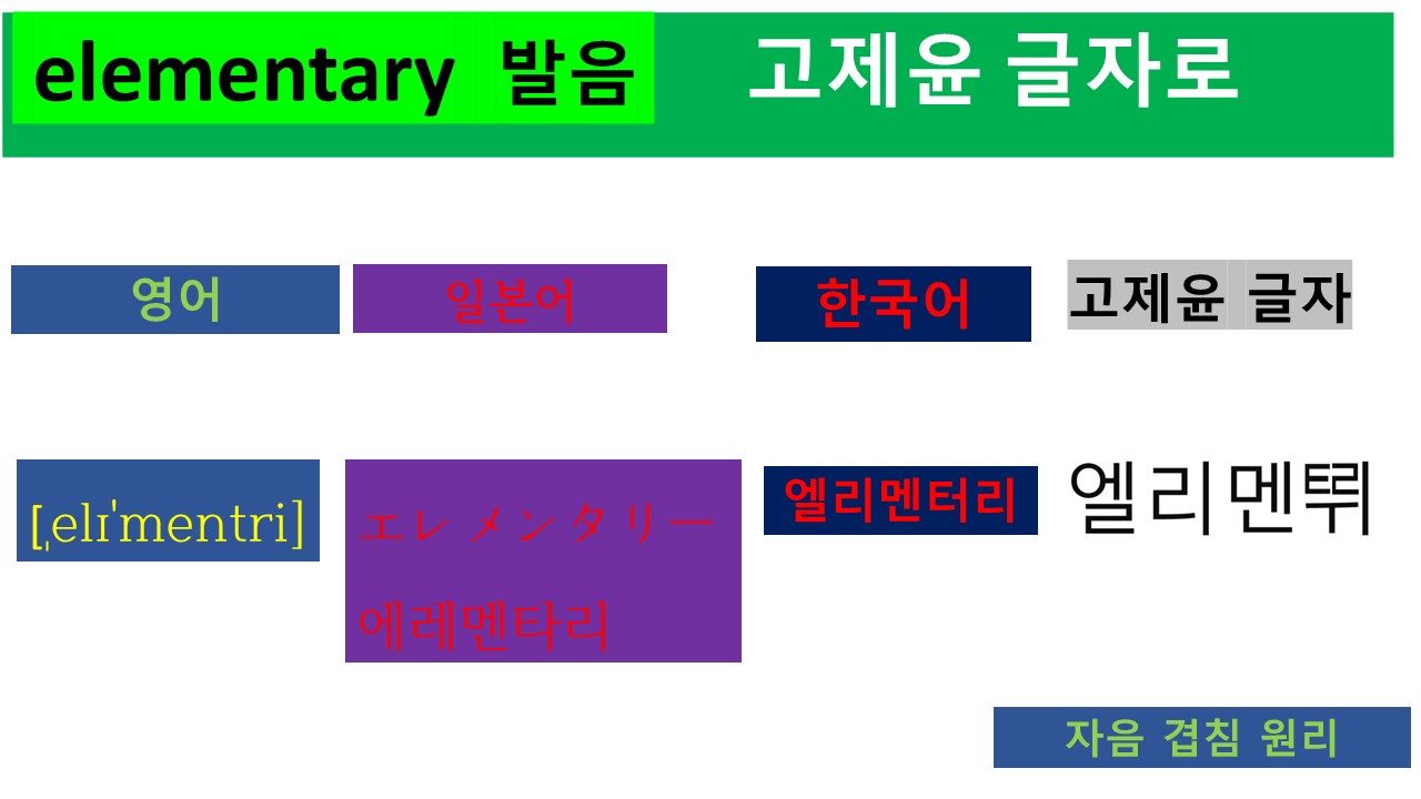 영어 단어 elementary를 발음 기호로 나타내면 [ ˌelɪˈmentri ]입니다. 이들 소리를 한글 가로 쓰기로 표현하면 [ㅔㄹㄹ ㅣ ㅁ ㅔ ㅌ 루 ㅣ]입니다. 한글 가로 쓰기에서 elementary의 'r'소리는 '루, 로'와 비슷하기에 모음을 넣은 글자 '루'로 표현하였습니다. 이들 소리를 훈민정음을 활용한 "고제윤 글자"로 표기하면 맨 오른쪽 글자와 같습니다. 특징적인 것은 'tr'소리를 첫 소리에 함께 표기하였다는 점입니다. 발음 기호에서 볼 수 있듯이 소리 글자를 그대로 표현한 것입니다.