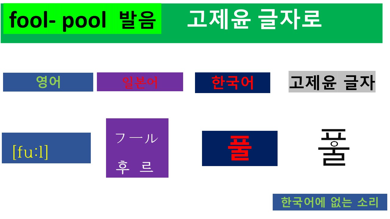 한국어에서는 fool과 pool을 '풀'로 발음합니다. 명확히 다른 f와 p소리이지만 같은 피읖으로 발음하고 있습니다. 이 둘의 소리를 구별하는 방법으로 훈민정음을 활용한 "고제윤 글자"에서는 f소리에 '피읖 아래 작은 동그라미를 그려 넣은 글자를 개발하여 구별하고 있습니다. F는 피읖 아래 작은 동그라미를 표기하였고, p는 피읖으로 표기하는 방법입니다.