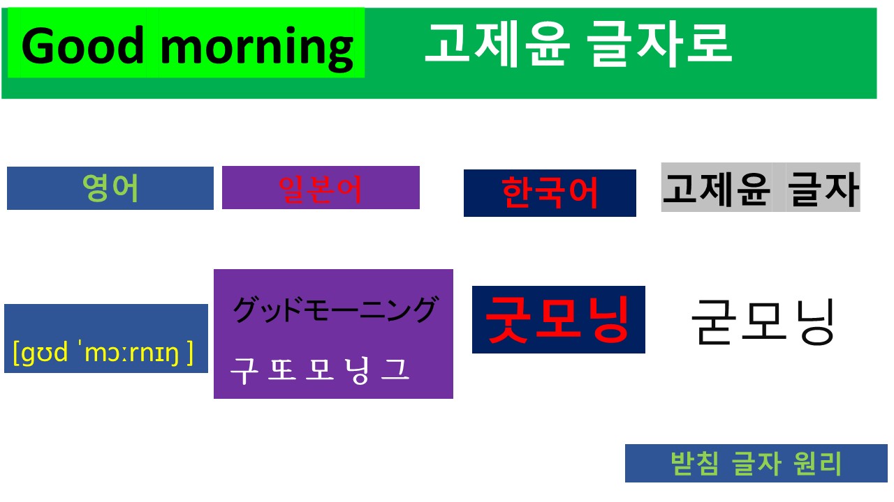 위의 소리를 훈민정음의 글자 원리를 활용한 "고제윤 글자"로 나타내면 '굳모닝'입니다. 소리의 호흡에 맞춰 모음을 기준으로 표현한 것입니다. 모음 하나는 하나의 호흡이므로 모음 'ㅜ, ㅗ, ㅣ' 세 개를 기준으로 세 개의 글자로 나타냈습니다. 참고로 미국인들의 발음에 들어있는 'r' 소리는 '몰'로 표현하는 경우 한글과의 혼란 발음을 일으킬 수 있어서 생략했습니다.
