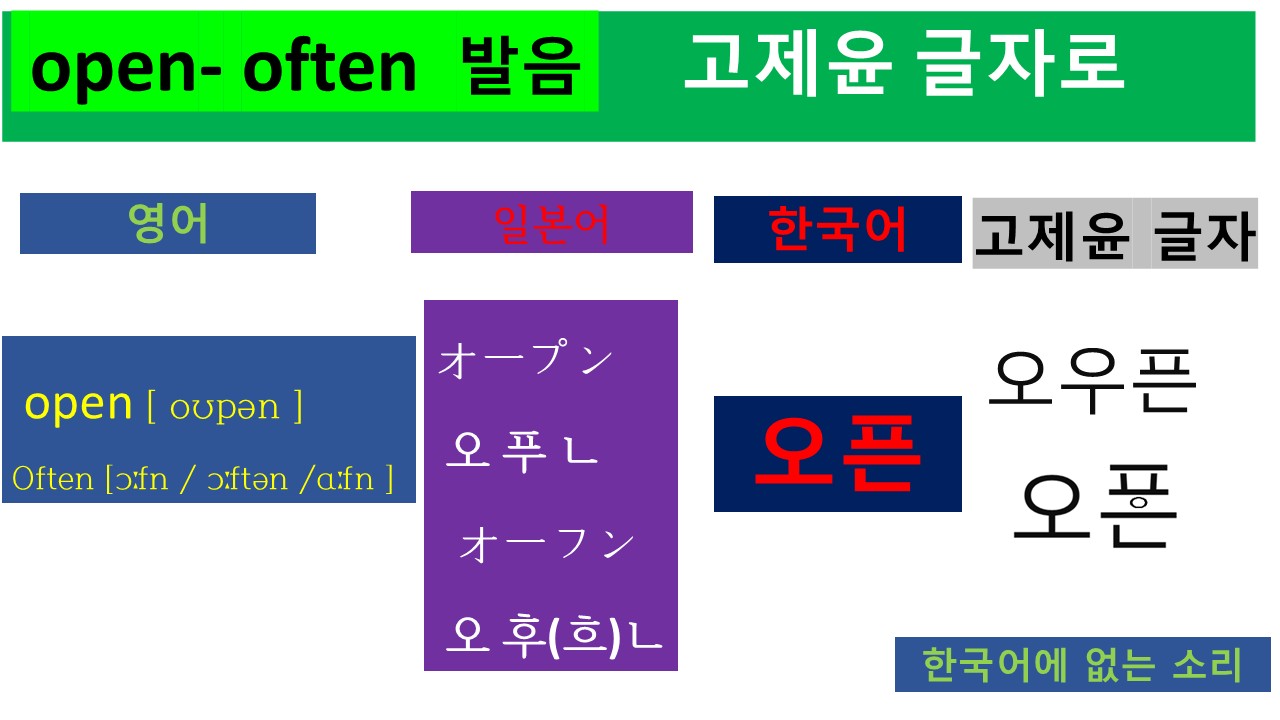 이렇게 두 개의 소리를 훈민정음을 활용한 "고제윤 글자"로 나타내면 맨 오른쪽의 글자로 나타낼 수 있습니다. Open은 '오우픈'으로 표현했습니다. Often은 한국어에 없는 f발음을 나타내기 위하여 피읖 아래에 작은 동그라미를 그려 넣어 표현했습니다. 영어의 f소리는 "윗니로 아랫입술을 물고 계속해서 마찰을 일으키는 소리"입니다. 이 소리는 한국어에는 없는 소리입니다. Open과 often소리를 구별하는 가장 큰 기준으로 p와 f소리에서 찾을 수 있을 것입니다. 또한 [pn]과 [fn]처럼 자음이 겹치는 경우에 영어에는 없는 'ㅡ' 소리를 넣어 표현했습니다. 자음 충돌을 회피하고, 좀 더 직관적으로 읽기 위함입니다.