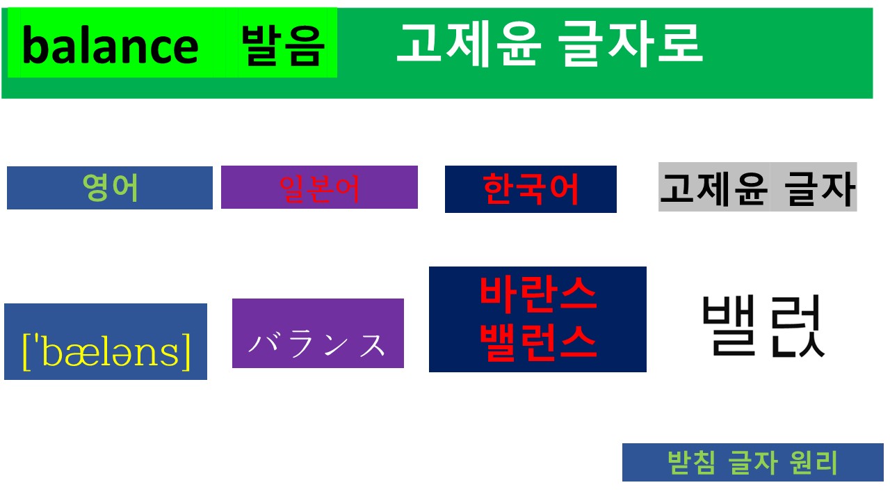 위의 글자에서 영어, 일본어, 그리고 한국어의 현재 발음을 보면 각 언어의 표기법을 볼 수 있습니다. 영어의 발음은 앞에서 말한 것처럼 [ㅂㅐㄹㄹㅓㄴㅅ]입니다. 영어의 'b'는 목젖이 울리는 소리의 특성을 갖고 있지만 비슷한 소리인 'ㅂ(비읍)'으로 표현했습니다. Balance의 앞의 'a'발음은 'ㅐ' 소리로 표현했습니다. 그리고 오늘의 주제 발음인 'l'은 두개의 리을로 표현했습니다. Balance의 뒤의 'a'는 'ㅓ' 소리로 표현했으며, n은 니은, 그리고 마지막 글자인 ce의 발음은 'ㅅ(시옷)'으로 나타냈습니다. 이 소리를 그대로 옮기면 '밸런ㅅ'입니다. 마지막 시옷은 현재의 한글에서는 모음 'ㅡ'를 넣어서 '밸런스'로 발음하고 있습니다. 영어에는 없는 'ㅡ' 소리가 들어간 것을 볼 수 있습니다.