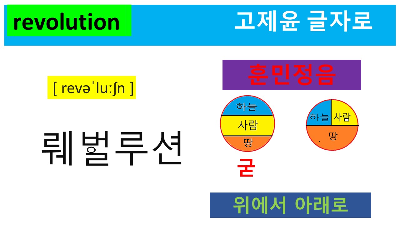 RPM에서도 사용한 revolution을 발음 기호로 표현하면 [ revəˈluːʃn ]입니다. 알파벳이나 발음 기호 모두 단순한 가로 쓰기입니다. 한글을 사용하여 같은 가로 쓰기로 표현하면 [루 ㅔ v ㅓ ㄹㄹ ㅜ 쉬(셔) ㄴ]입니다. 이를 훈민정음의 글자 원리를 활용한 "고제윤 글자"로 표현하면 위의 표에서 나오는 것과 같이 표기할 수 있습니다.